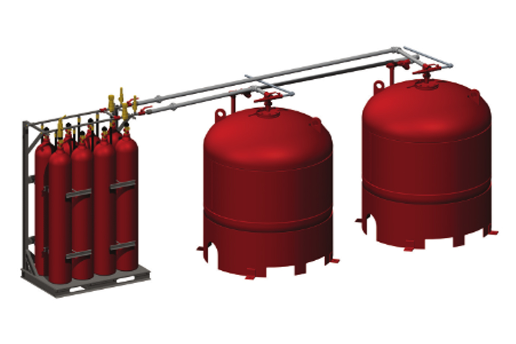 The TYCO AQUAMIST Red-E Mist Supply Skid is a tank-based nitrogenpropelled water supply unit for the Ultra Low Flow AQUAMIST System. The Red-E Mist Supply Skid consists of a bank of nitrogen supply cylinders and one or two water supply tanks. The nitrogen is regulated to pressurize the head space inside the tank, pressurizing the water used to supply the Ultra Low Flow AQUAMIST System.